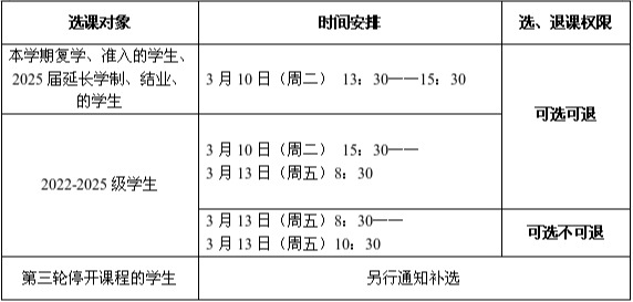 三、课表预览:本次第三轮选课新增选课课表预览功能,学生可登录教务系统,在“自主选课”界面查询课程情况。该预览功能开放时间为:3月10 日(周二)11:00—13:00。