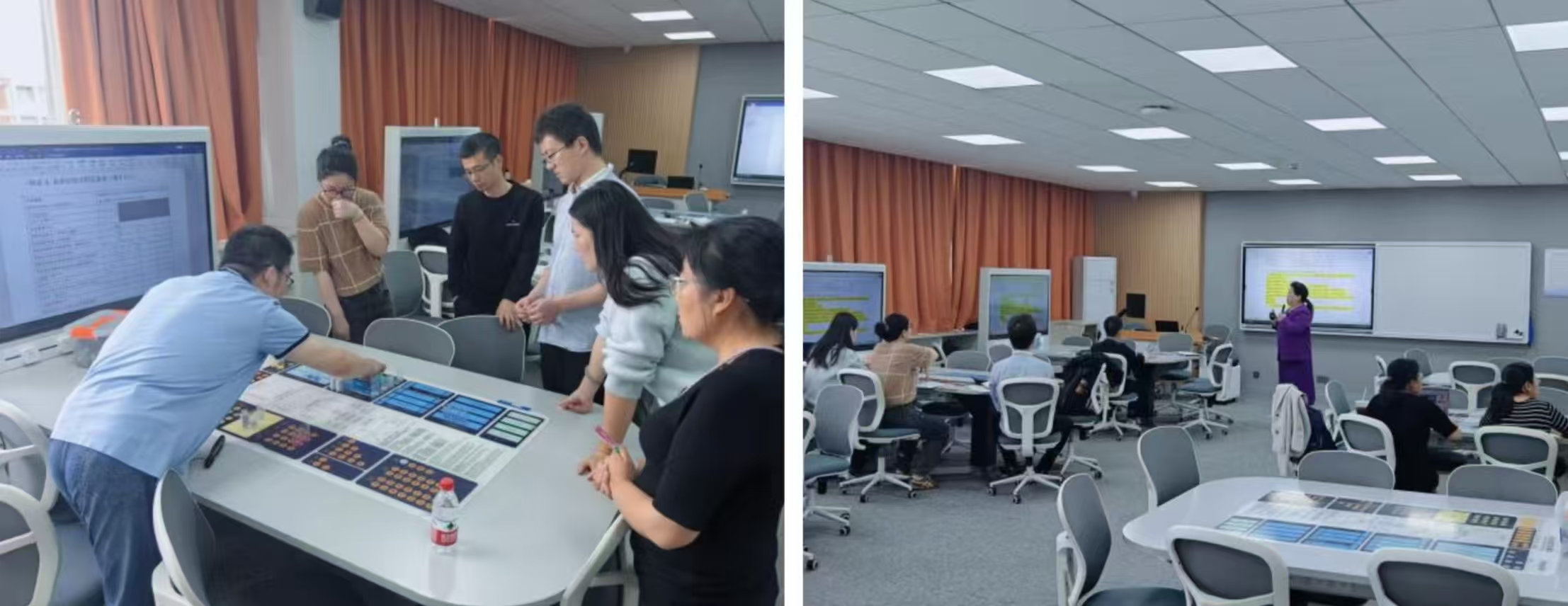 随后,在漆世雄老师的带领下,参训教师们开展沙盘实操演练环节。老师们分组模拟、亲身实践企业运营全流程,在沙盘操作中感受市场竞争、生产决策、财务管控等实战环节,沉浸式体验沙盘教学的魅力。大家热烈讨论、深入思考,积极将理论培训知识转化为实操能力,展现出勤于钻研、勇于实践的良好作风。